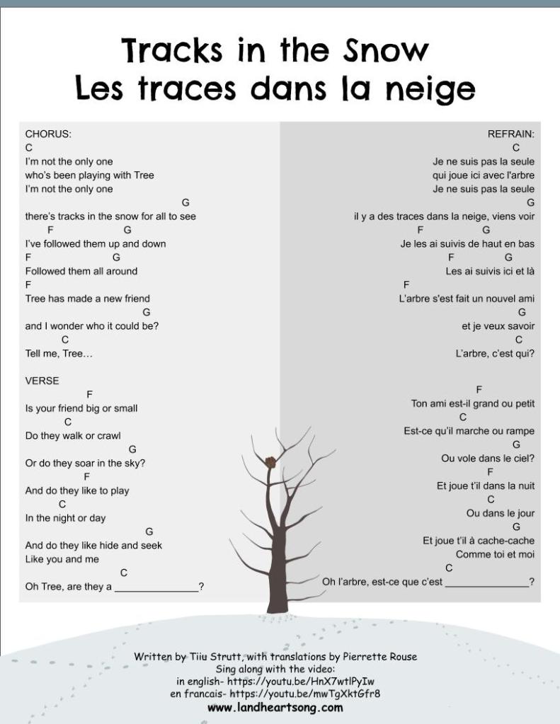“Tracks in the Snow” (Les traces dans la neige) is a song that I wrote to support children in looking more closely in the land during the winter months, and in learning to ask questions about what they notice. I always ask students to ‘fill in the blank’ as we sing together, and their suggestions are often informative. I like to sing the song with children as a provocation, before we go outside, when a fresh blanket of snow is on the ground. At the beginning of the season, the song can give me a sense of their knowledge and understanding of what animals are likely spending the winter in our community. I also like to sing it throughout the winter months, as, well, it’s really a lot of fun, and also, because it allows stories of what children have been noticing in the land come out. It can also give me a sense of how their knowledge and understanding of local animals is growing.