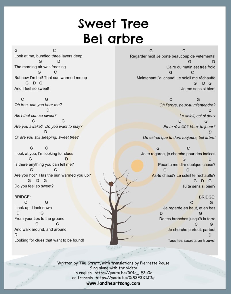 I share with you today the song “Sweet Tree” (“Bel arbre” in French). This song captures the excitement of this time of year, when the days get longer, the sun gets stronger, and the Maple trees are magical. This song is intended to spark curiosity, and encourage children to look closely at the Maple trees for clues and signs of the changing seasons.