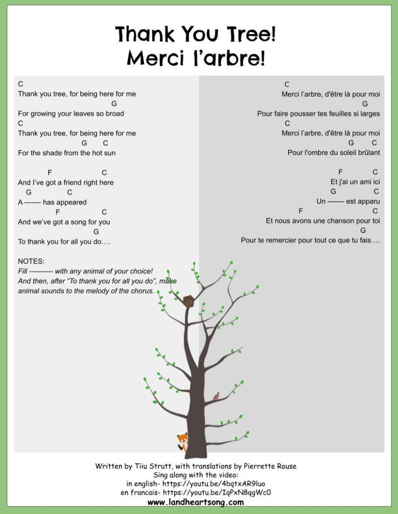 “Thank You, Tree” (“Merci l’arbre” in French) was written for just these moments- whether you are in school, working in the forest, or racing from shaded area to shaded area on the sidewalk during a walk around the block with your family. This song is meant to send a heaping amount of joyful gratitude to our beautiful trees for their gift of shade.