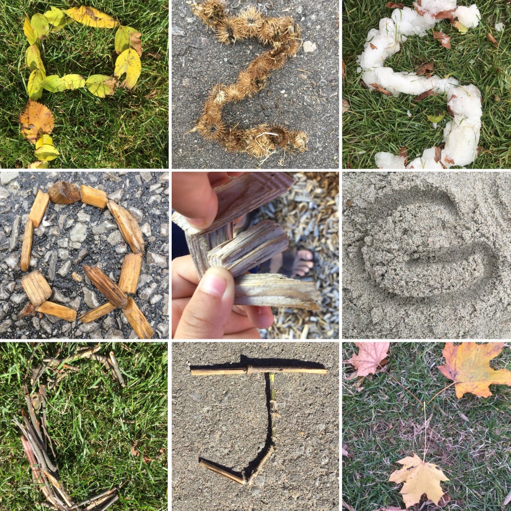 A couple of years ago I transferred schools, and these last two questions became the backbone of my work, allowing me to get to know the new land I was working in, as well as the new community I was working with. For the first two months, everyday, the children chose a new letter to create and find. Off we would go, looking for the letter in the land, and creating new and fun ways to write the letters. On our mission, we learned about all of the special outdoor learning spaces our school has, including the rolling hill and the sandbox. We learned about each other as we worked together; sometimes children chose to pair up or make groups to make giant letters with their bodies. We also established all of the necessary routines that would enable us to successfully engage in regular outdoor learning. It was incredibly fun, and we created a wonderful end product- a letter wall for our school hallway with pictures of all of the different ways we made the letters of the alphabet.